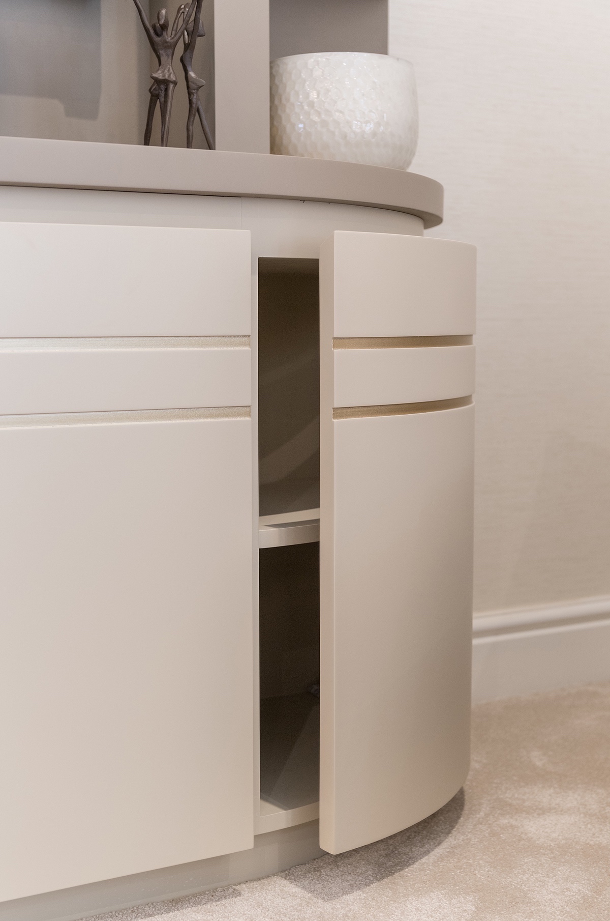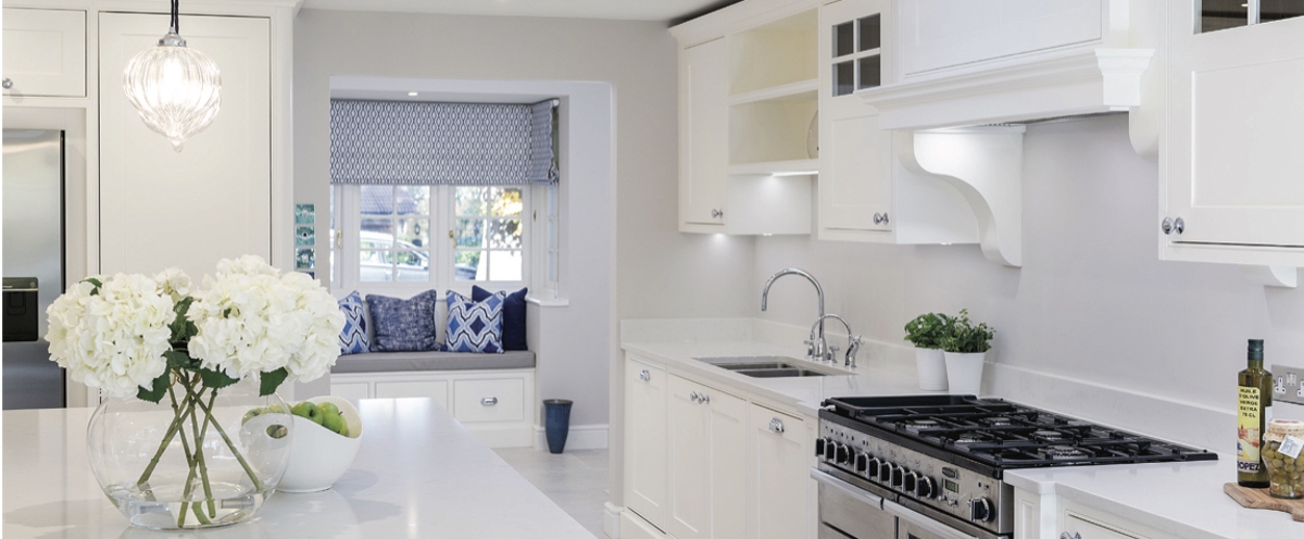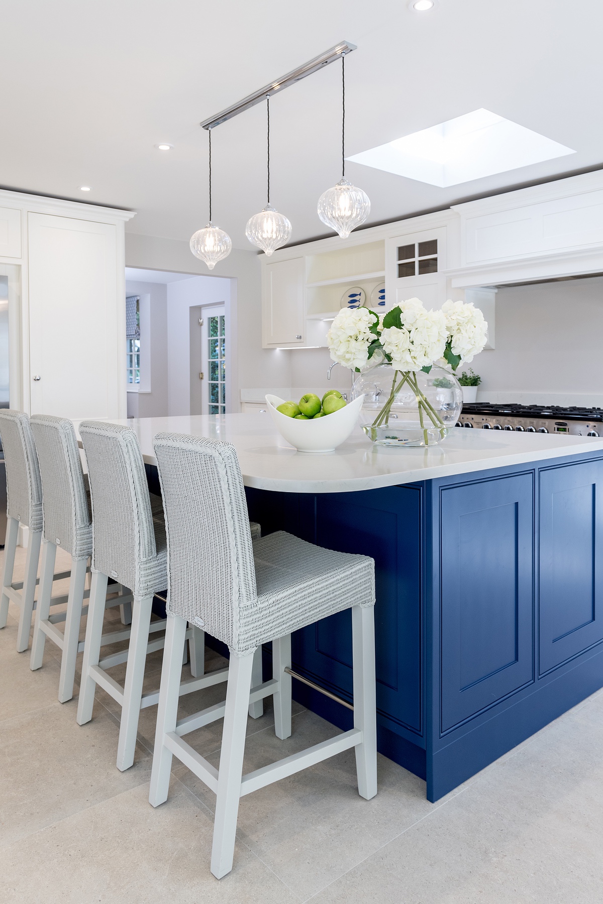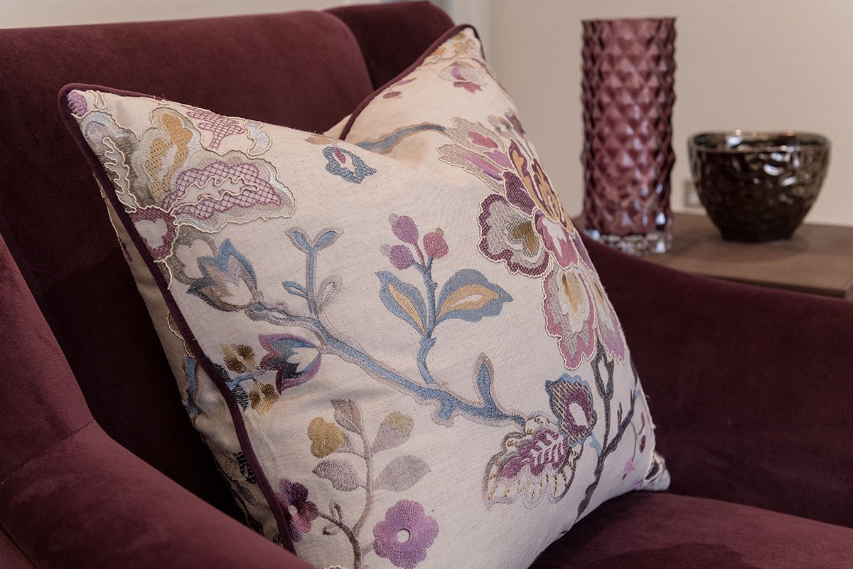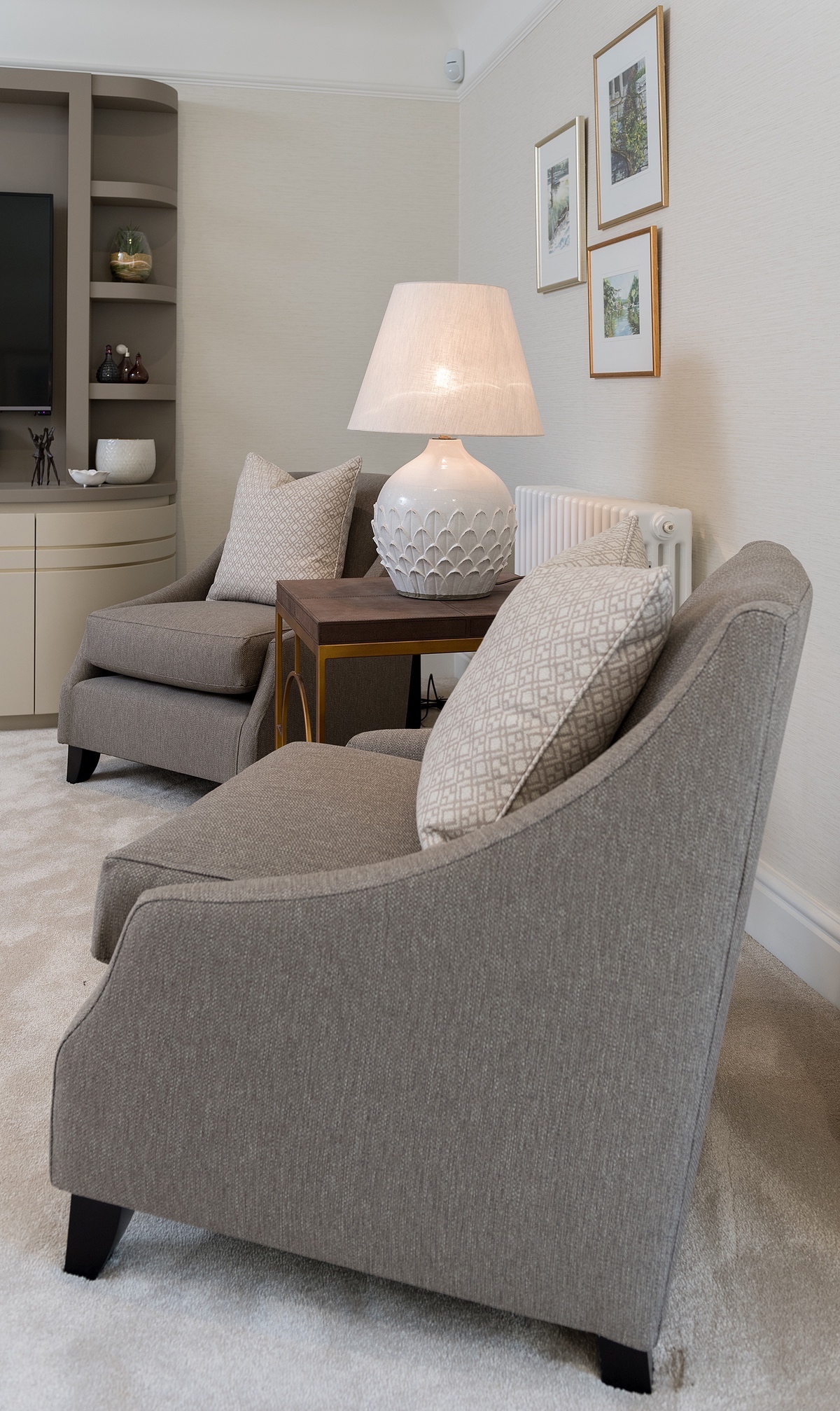 Situated in the exclusive Burwood Park estate we worked with our clients to remodel their cherished family home. We combined several small dark rooms to create a new open plan kitchen and family living space. The colour palette in this space was inspired by a bold abstract artwork which the Client loved and can be seen hung with pride above the bar area. The sitting room was also redesigned as a more formal space with quality upholstery and a bespoke media unit.