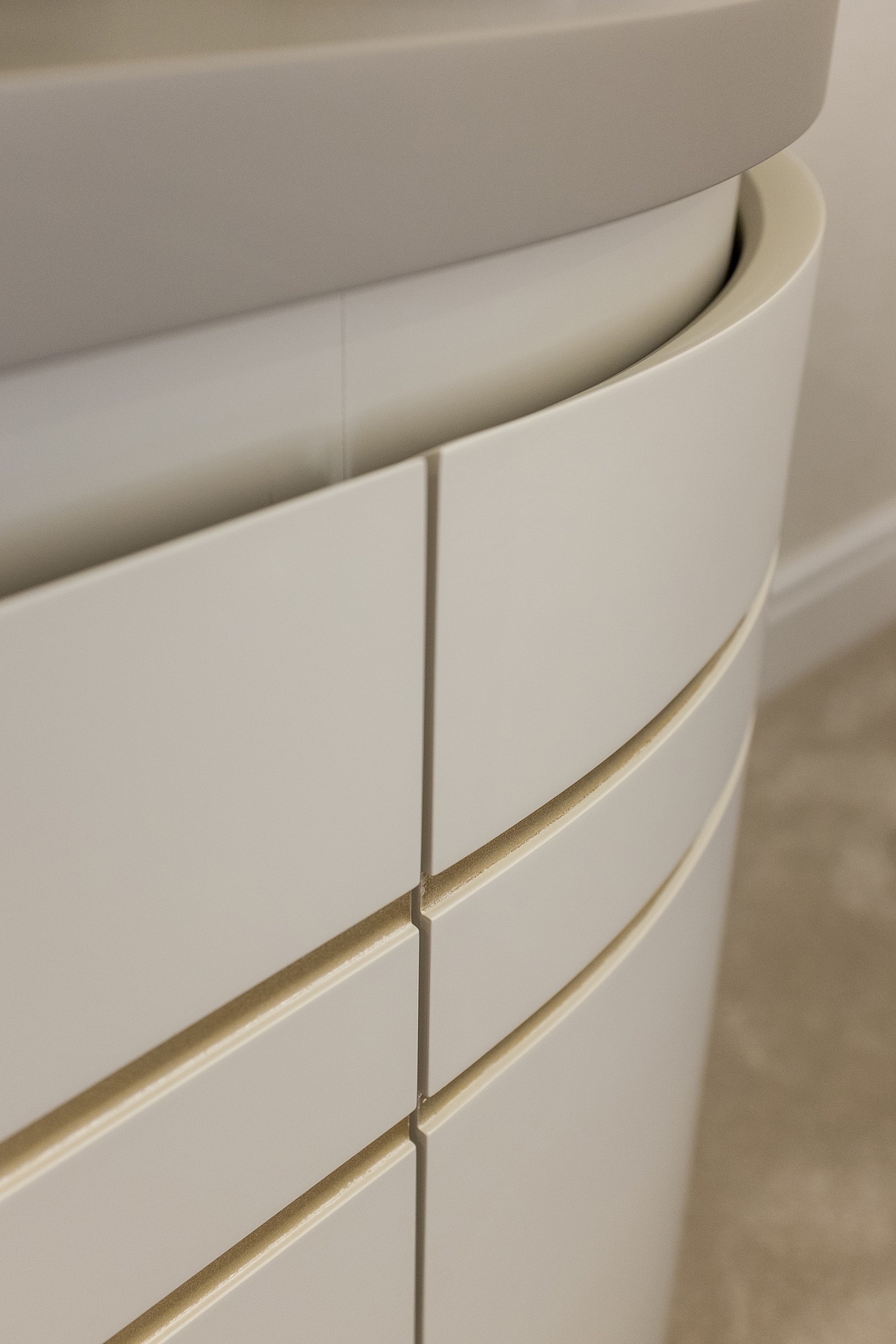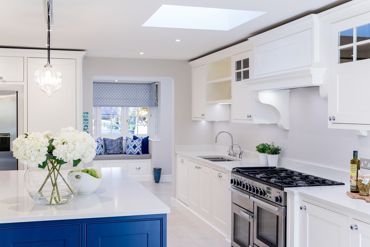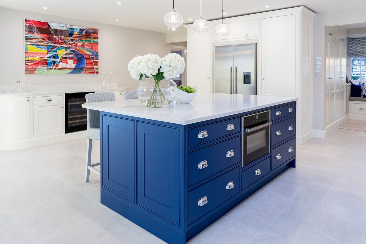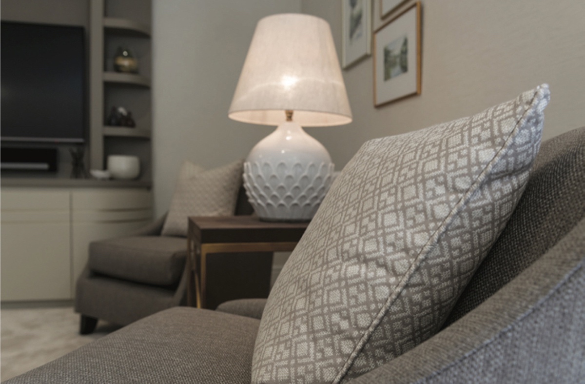 Situated in the exclusive Burwood Park estate we worked with our clients to remodel their cherished family home. We combined several small dark rooms to create a new open plan kitchen and family living space. The colour palette in this space was inspired by a bold abstract artwork which the Client loved and can be seen hung with pride above the bar area. The sitting room was also redesigned as a more formal space with quality upholstery and a bespoke media unit.