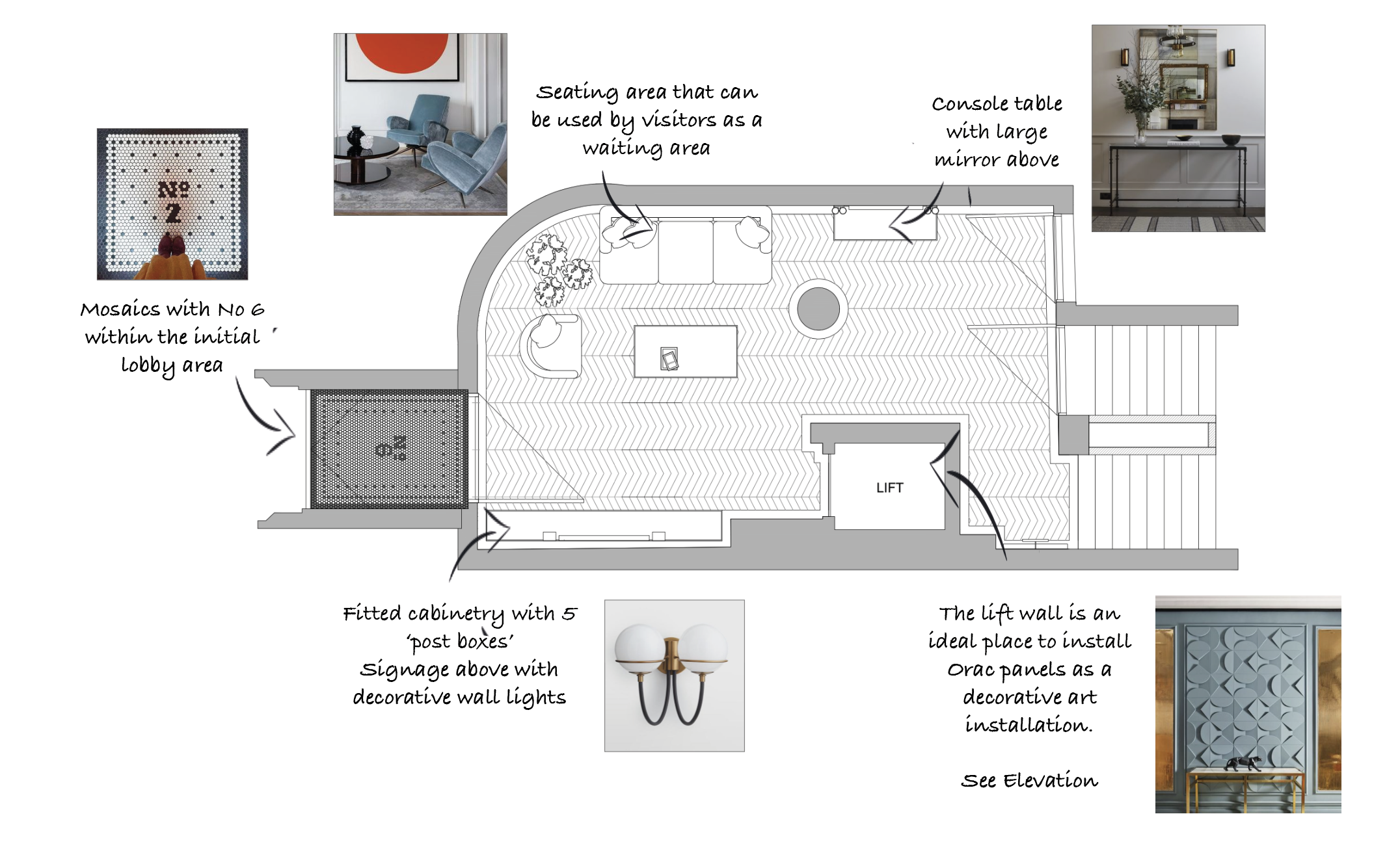 With no reception areas in the actual office suites it was important that the lobby can act as a waiting area for clients. A sofa and armchair will act as a welcome area. Built in cabinetry to house a ‘post box’ for each of the floors will ensure the space stays clear from clutter. Decorative wall lights and signage on a marble slab will create a strong focal point.