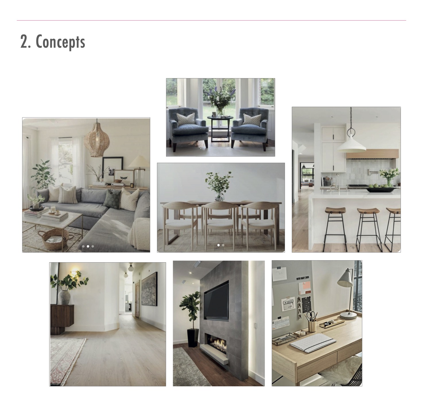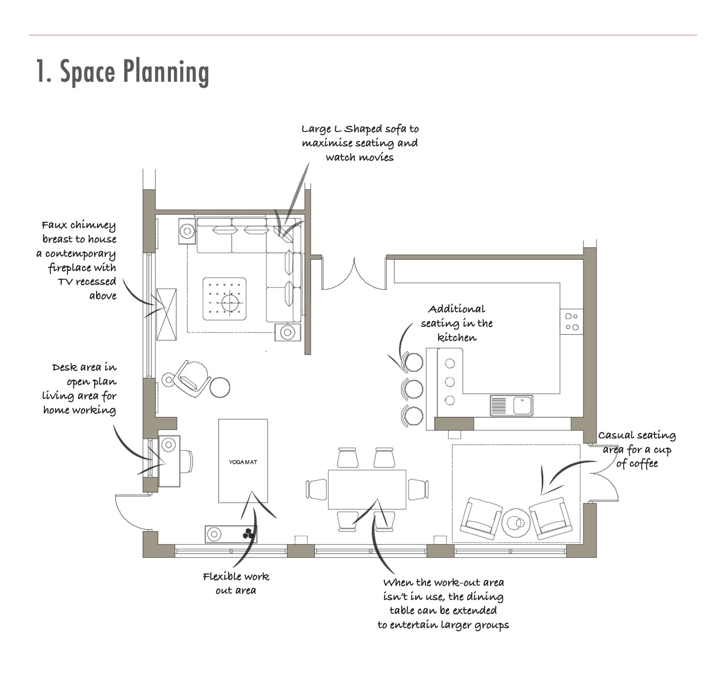Area rugs will be used to soften the space and define different zones.