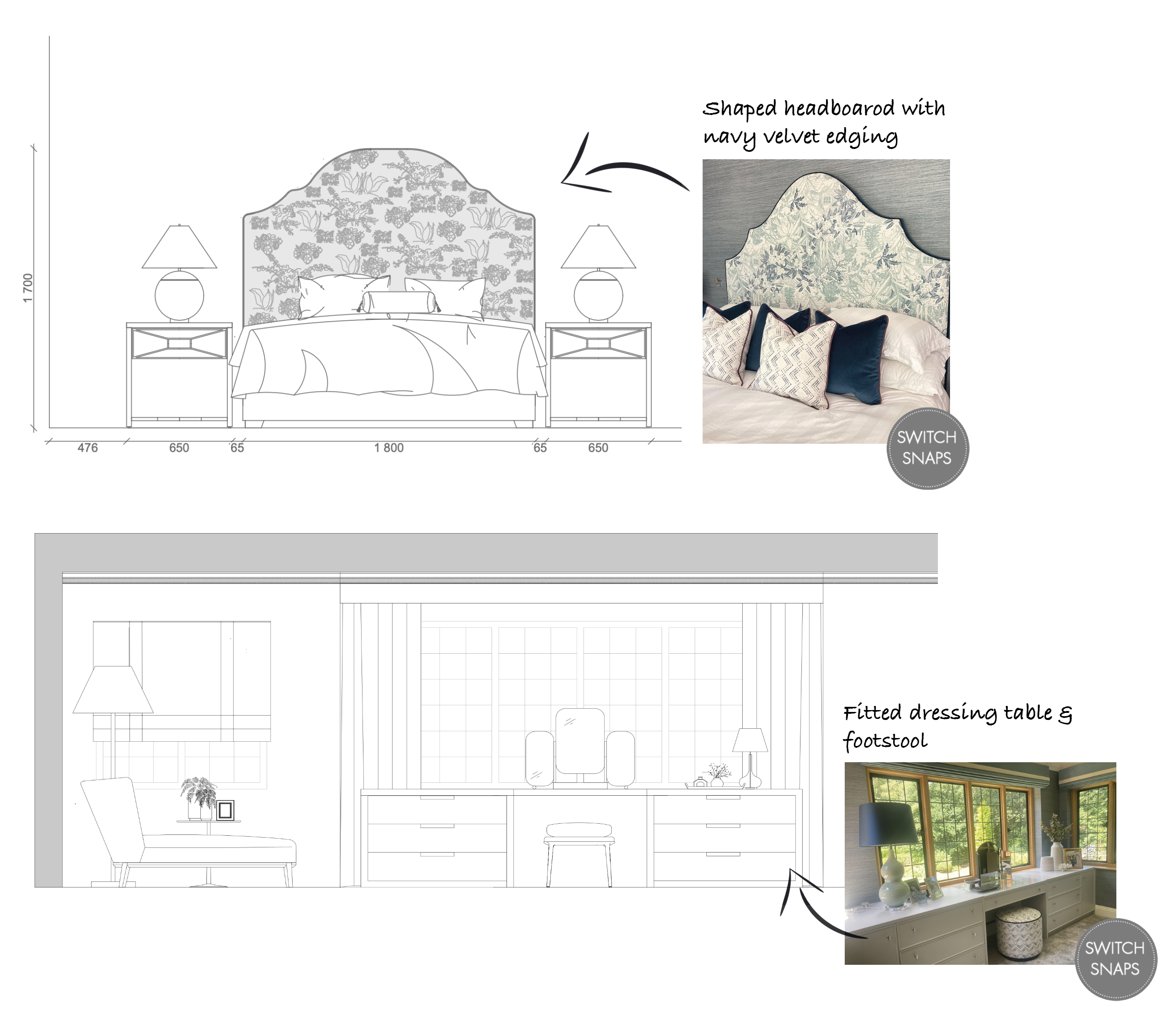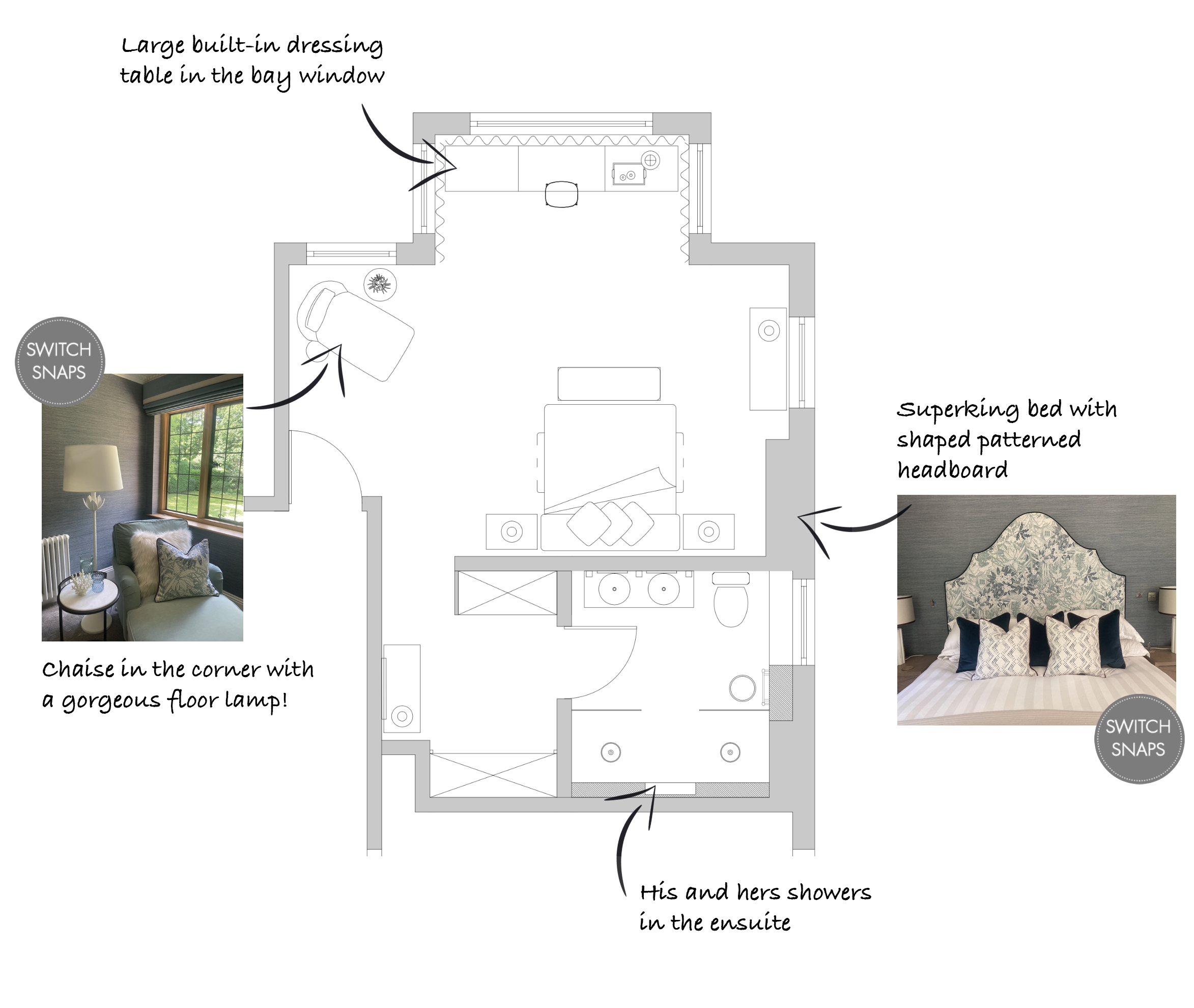 In this large master suite, we started with the superking bed with a large shaped patterned headboard in one of our favourite fabrics – Rapture & Wright Webbs Wonder.