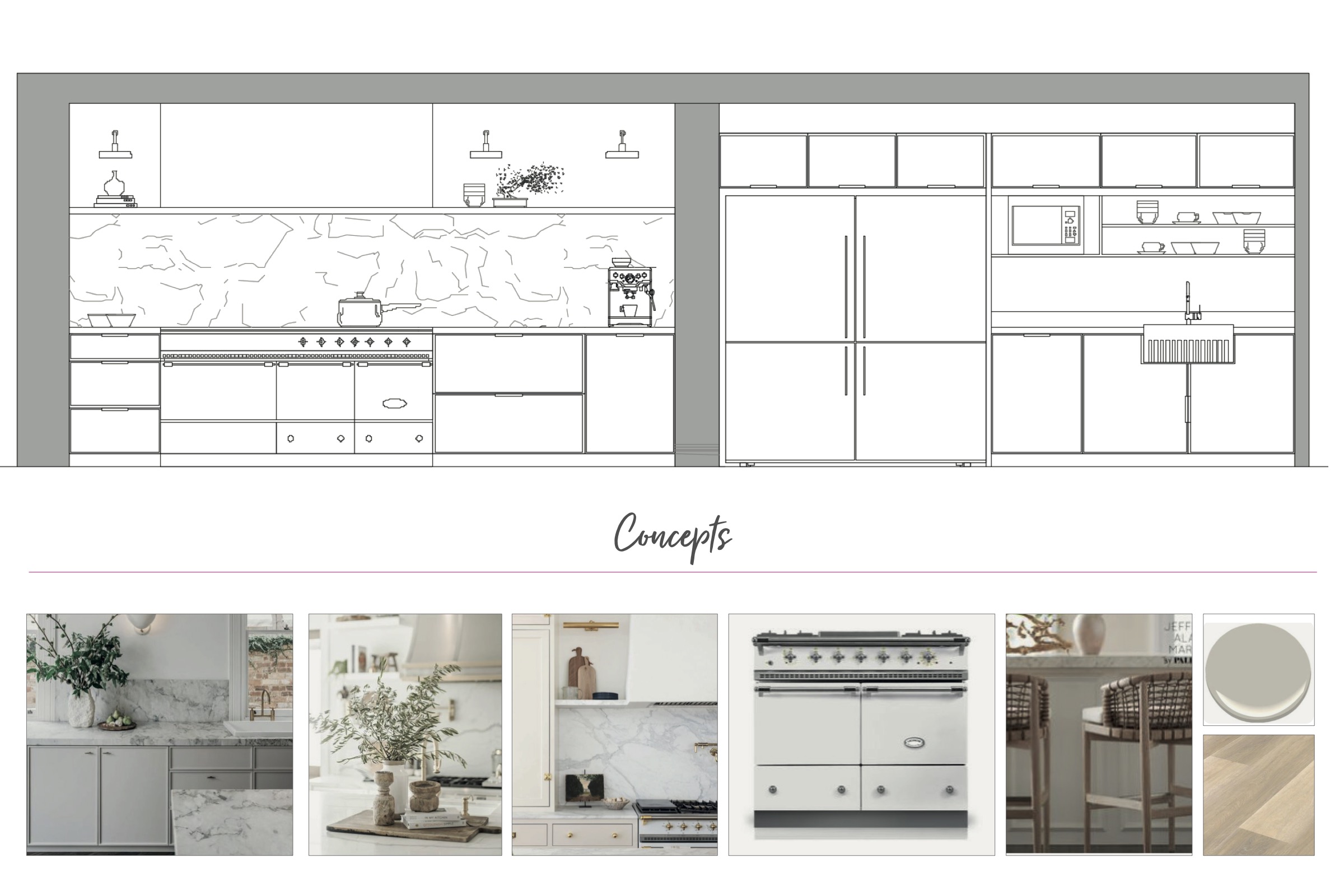Right: Back elevation of kitchen, concepts and finished kitchen with full styling.